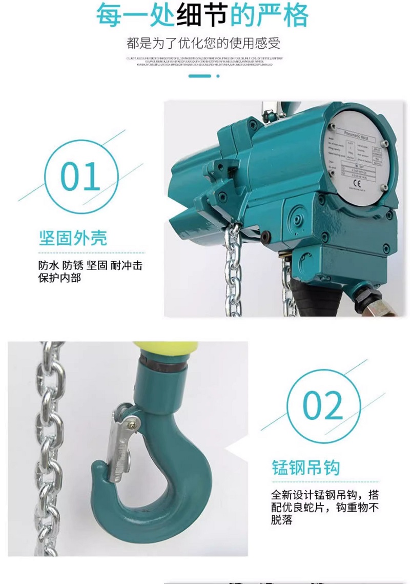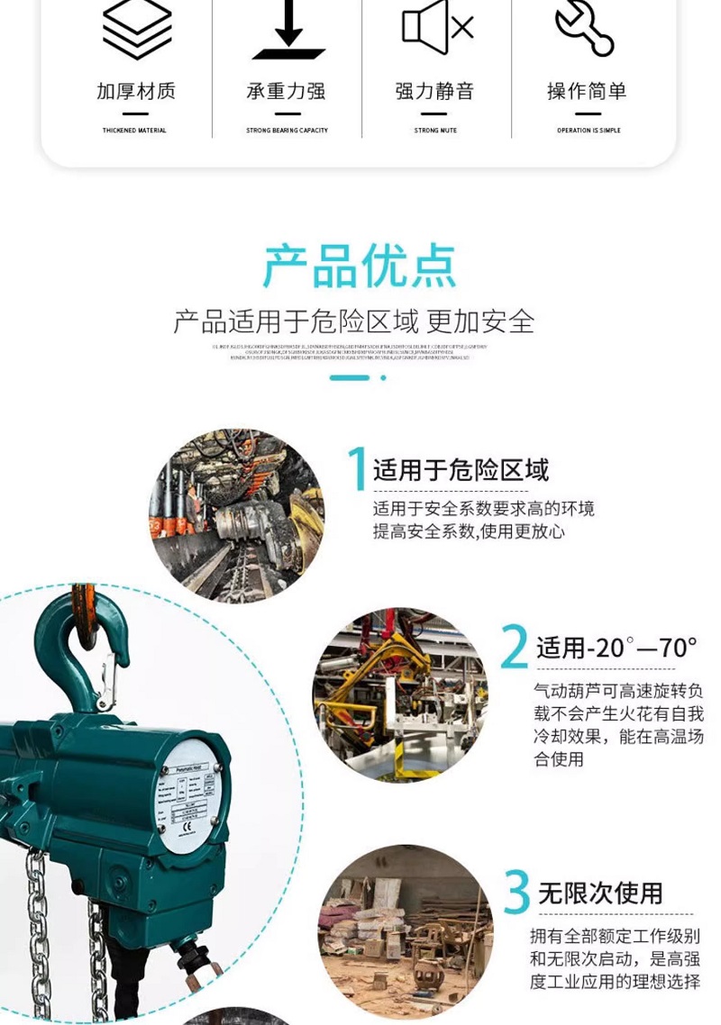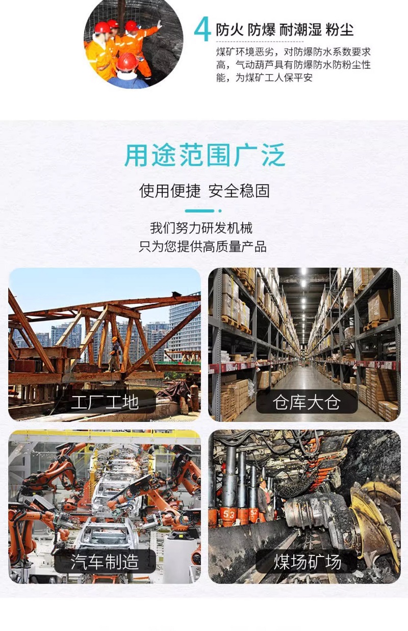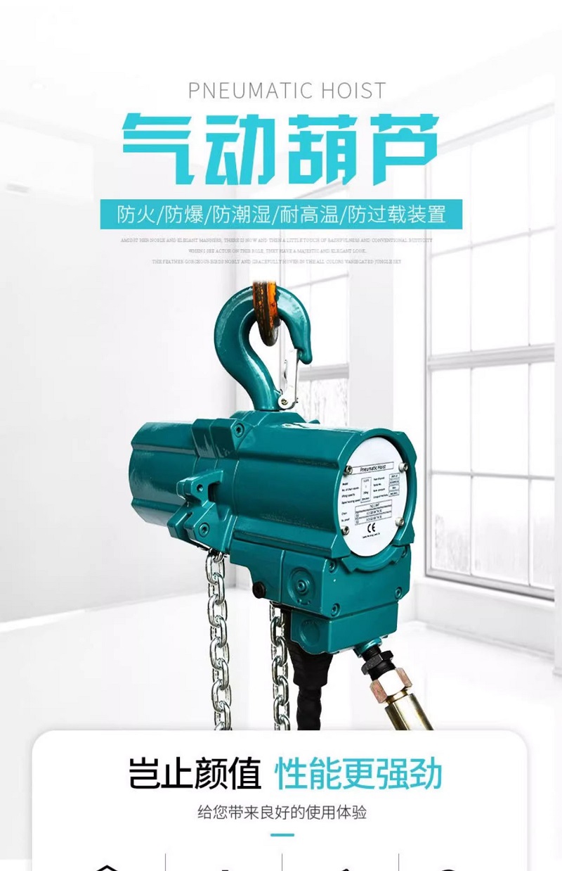 氣動(dòng)葫蘆不燒油不用電,依靠高壓氣體作為動(dòng)力實(shí)現(xiàn)起吊重物的作用,常適合于高溫、潮濕、粉塵等惡劣環(huán)境使用,所以通常它的特性為防塵防爆,比如在礦用井下領(lǐng)域使用就比較合適。